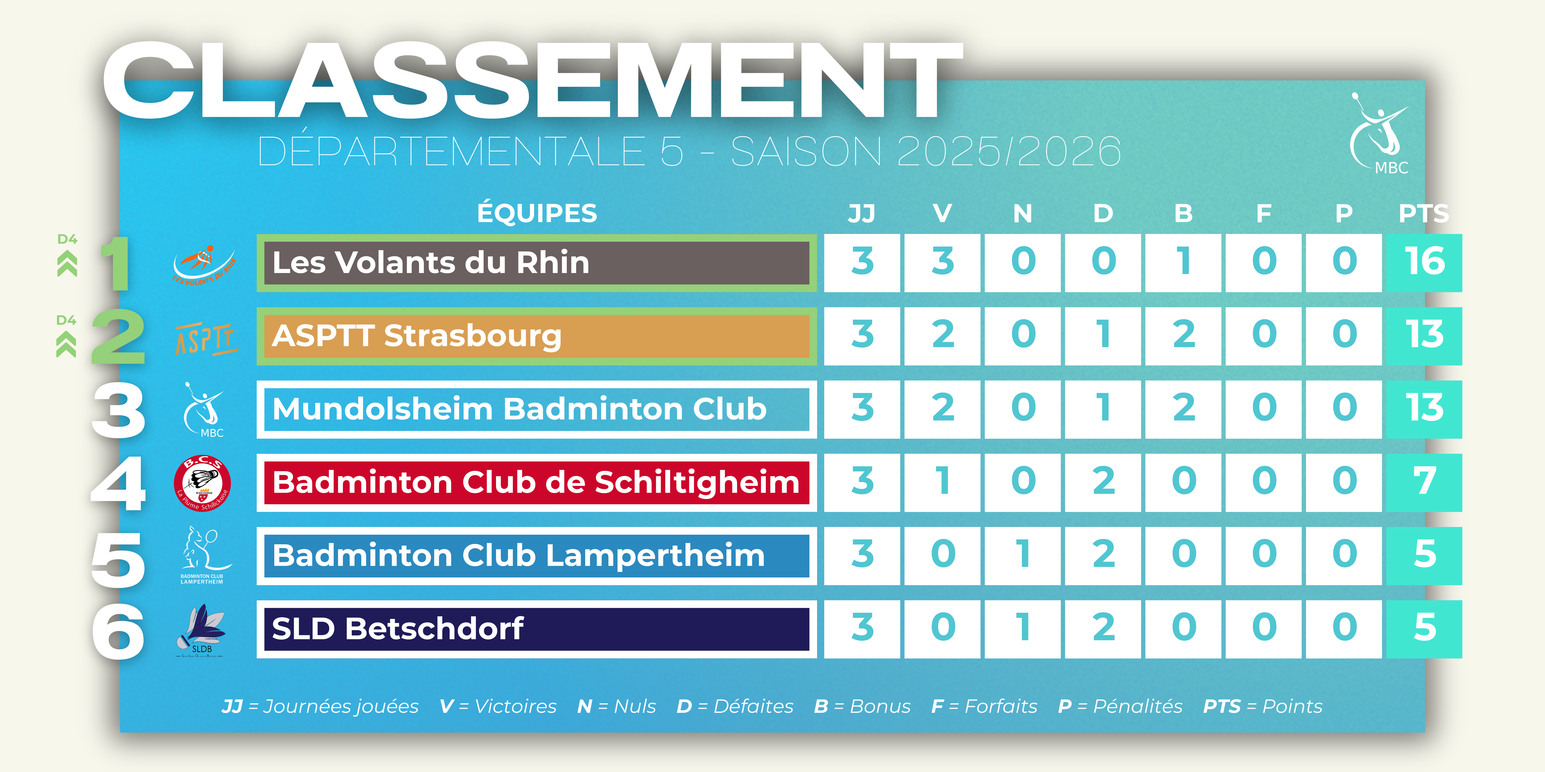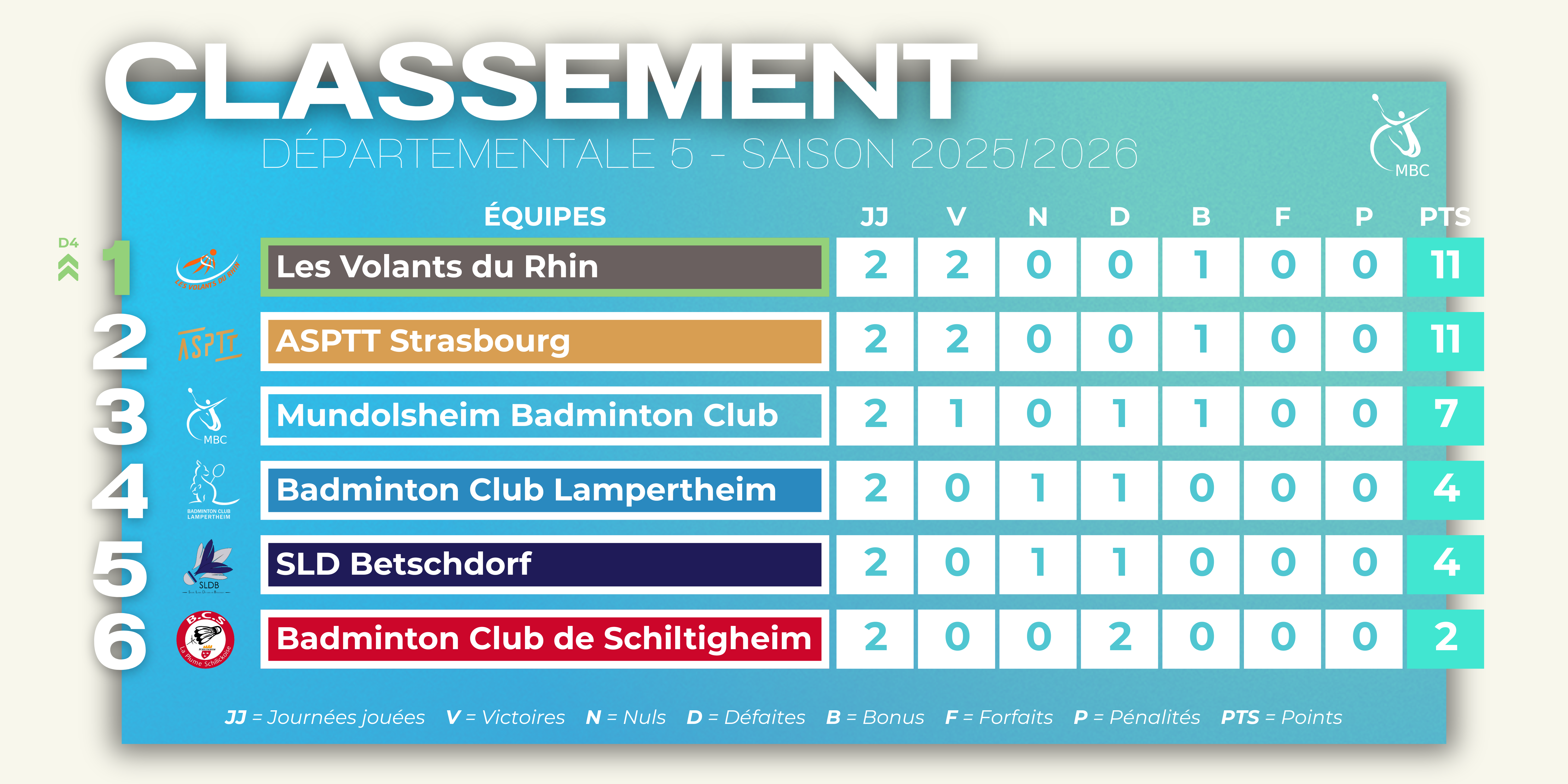 Équipe 4 – D5 Classement Résultats & Calendrier Cliquez sur le résultat pour voir le détail de la rencontre